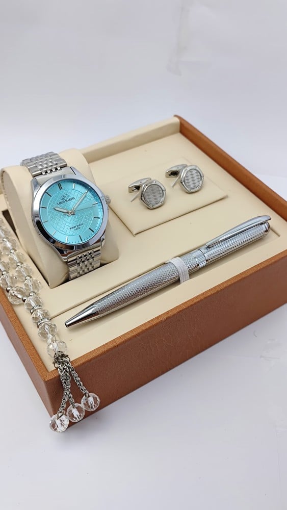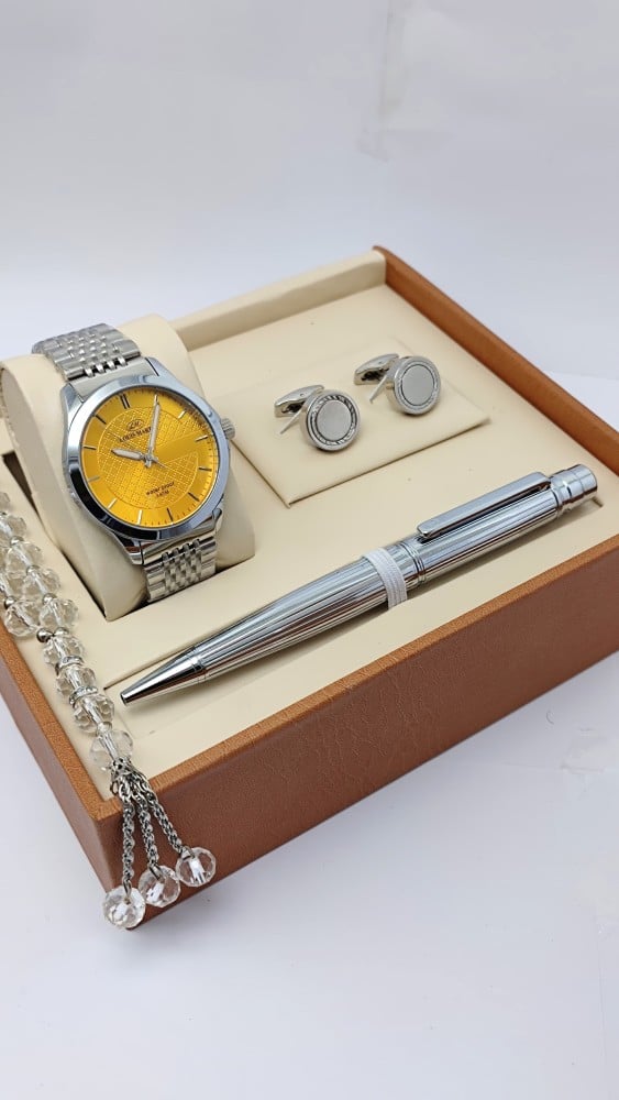 استعد لتجربة فاخرة ومتكاملة مع بكج هدية رجالي طقم ساعة رجالية من الستيل يحتوي على ساعة، كبك، قلم، وسبحة، يتمتع هذا الطقم الرائع بالتصميم الأنيق والتفاصيل الدقيقة ليضفي لمسة من الفخامة والتميز على أناقتك الرجالية، احصل على هذا الطقم الرائع واستمتع بالرفاهية والفخامة في جميع جوانب أناقتك الرجالية،